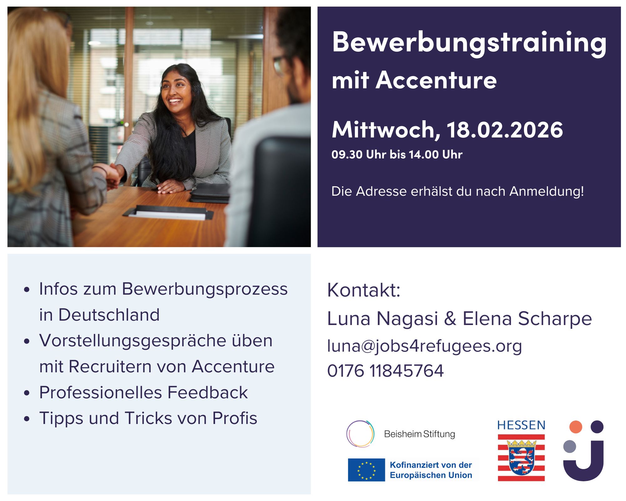 Jobs4refugees veranstaltet am 18.02.2026, zusammen mit ihrem Partnerunternehmen Accenture, ein Bewerbungstraining für interessierte Menschen mit Flucht- und Migrationsgeschichte.